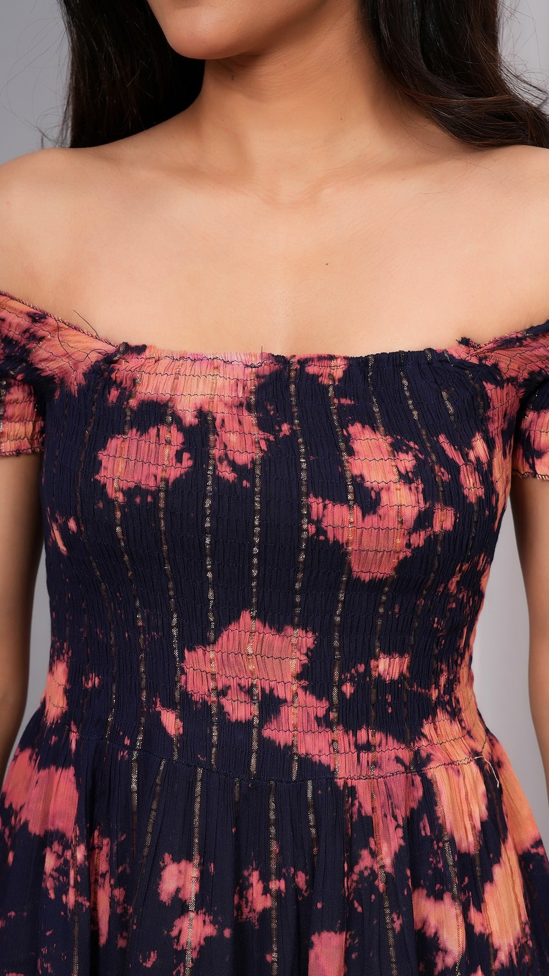 Iqraar Women Tie and Dye Dyed Smocked Off-Shoulder Fit and Flare Midi Dress
