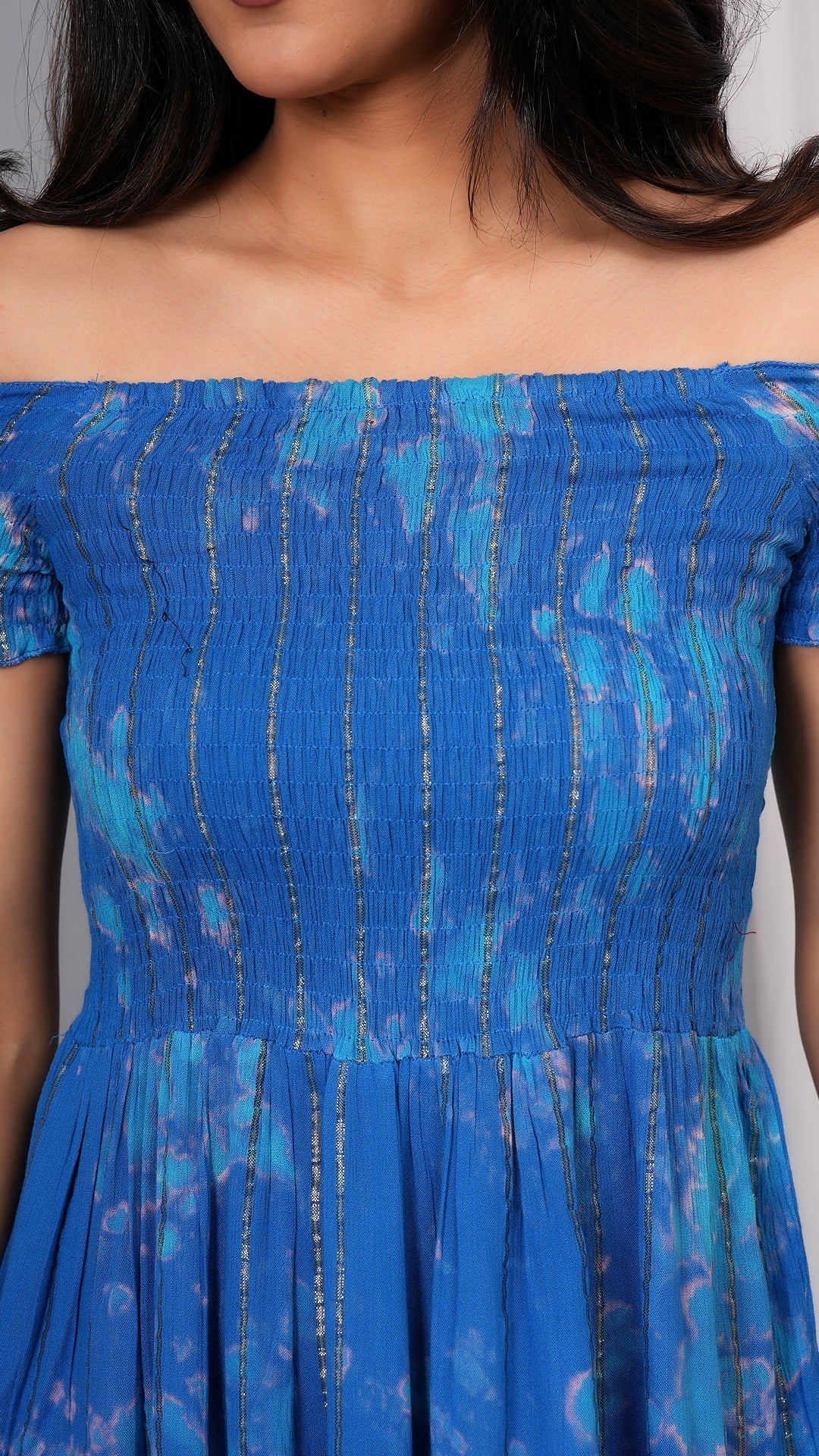 Iqraar Women Tie and Dye Dyed Smocked Off-Shoulder Fit and Flare Midi Royal blue Dress