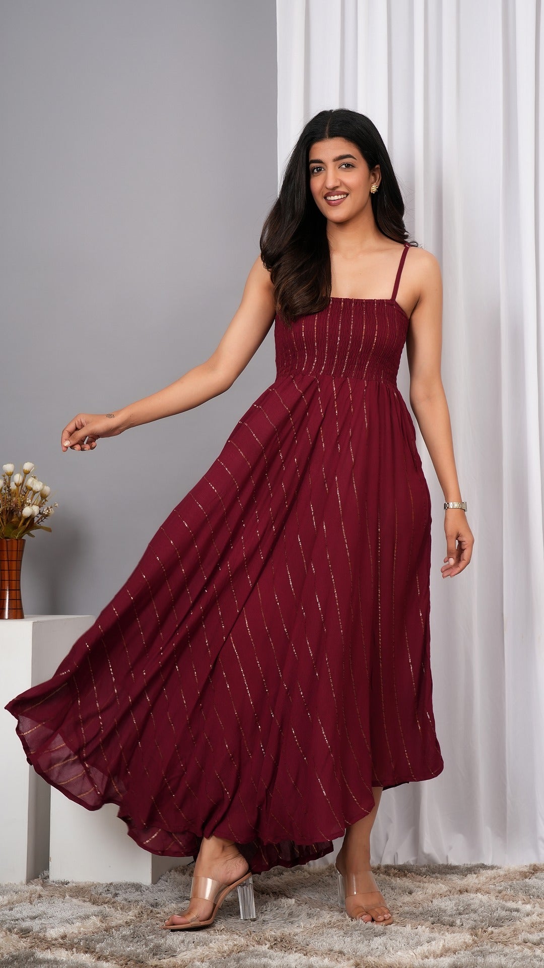 IQRAAR Women Lurex Rayon Fit & Flared Western Wear Dress (Wine)