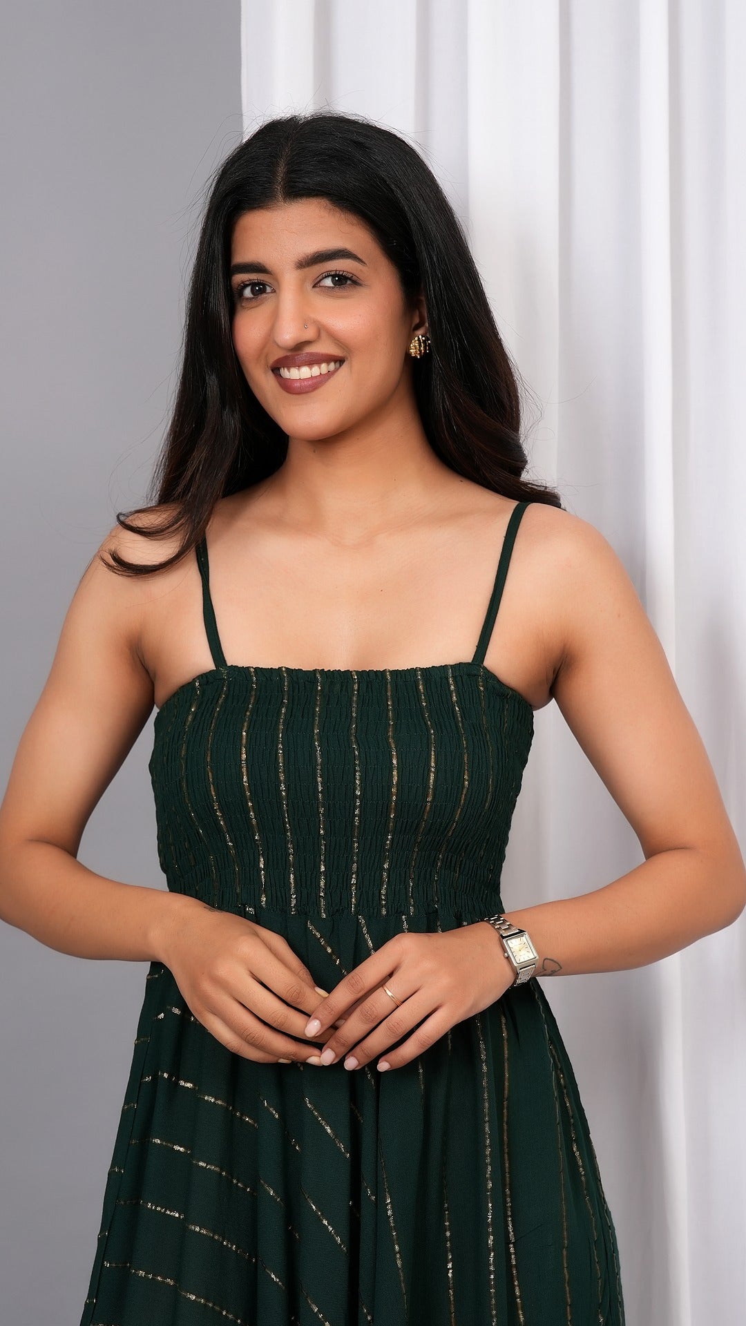 IQRAAR Women Lurex Rayon Fit & Flared Western Wear Dress (Green)