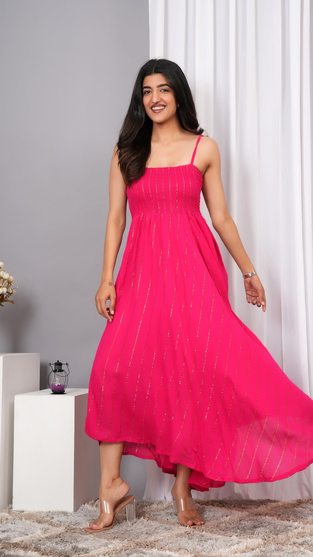 IQRAAR Women Lurex Rayon Fit & Flared Western Wear Dress Pink