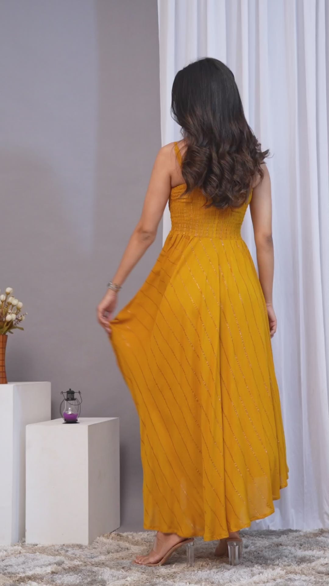 IQRAAR Women Lurex Rayon Fit & Flared Western Wear Dress Mustard