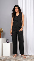 This black cotton waistcoat paired with matching trousers delivers a classic, professional look with exceptional comfort. Crafted from breathable cotton fabric, the set ensures durability and ease of movement while maintaining a sharp, tailored silhouette. Perfect for formal occasions or office wear, this ensemble combines timeless style with practical comfort.