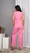 This babypink cotton waistcoat with matching trousers offers a comfortable and stylish outfit choice. Crafted from soft, breathable cotton, it gently fits your body, allowing you to move with ease throughout the day. Whether for a special event or professional wear, this set supports you in looking polished and feeling confident.
