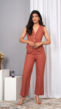 This rust-colored cotton waistcoat with matching trousers combines elegance and comfort in a versatile ensemble. Crafted from breathable cotton, it offers a tailored fit that enhances your silhouette while allowing ease of movement. Perfect for formal occasions or professional settings, this set ensures a polished and confident look throughout the day.