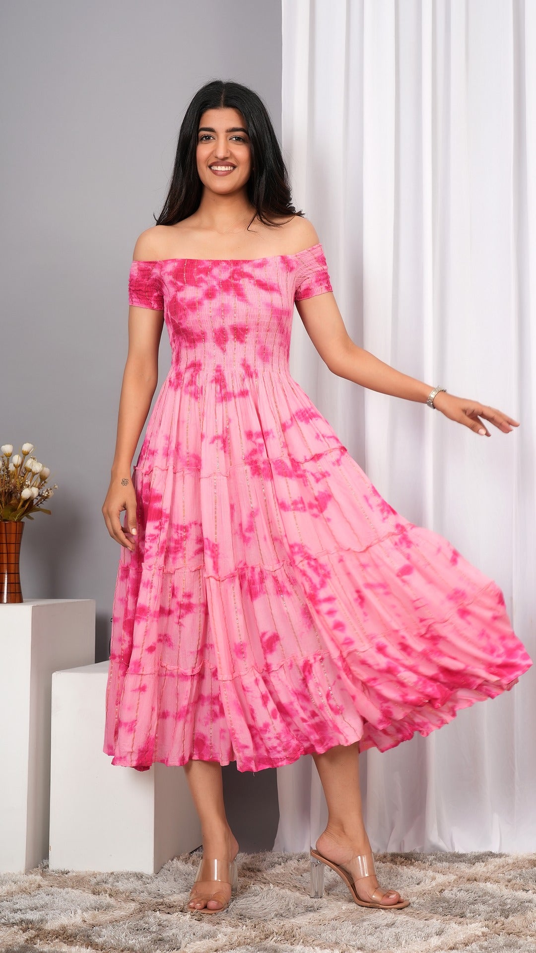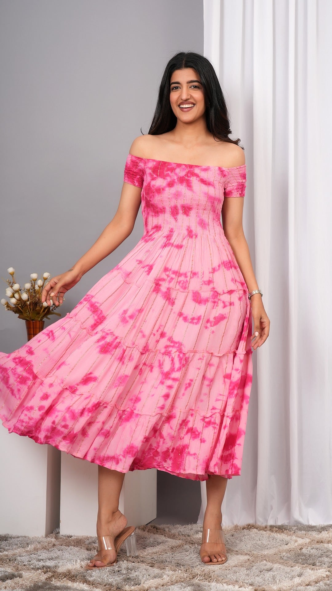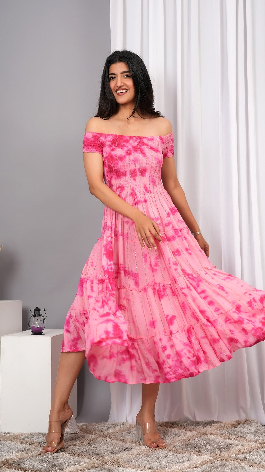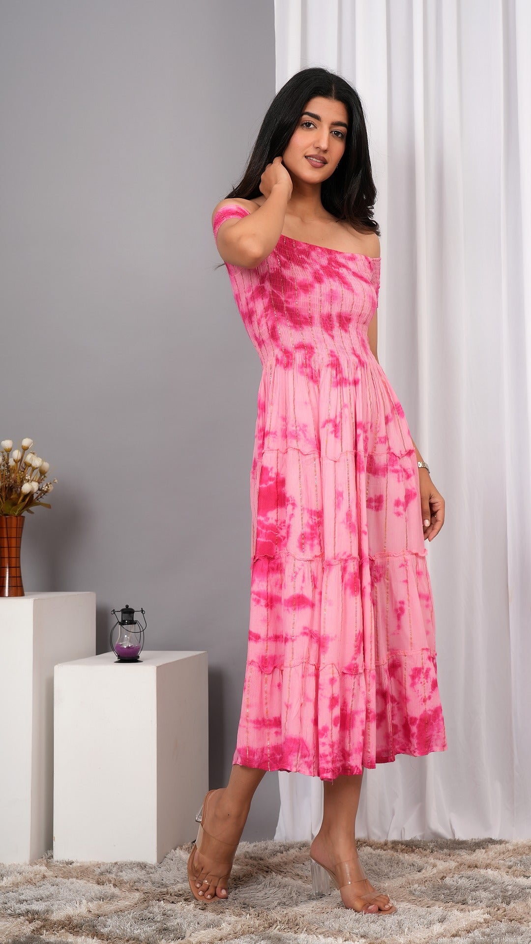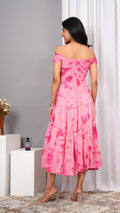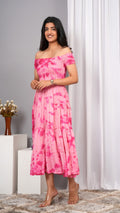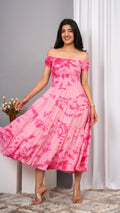 Elevate your wardrobe with the Iqraar Women Tie and Dye Dyed Smocked Off-Shoulder Fit and Flare Midi Baby pink Dress. Featuring a delicate off-shoulder neckline and a smocked bodice, this dress offers both comfort and style. The tie-and-dye pattern creates a unique, vibrant look, while the fit and flare silhouette flatters your figure effortlessly. Ideal for casual outings or special occasions, this midi dress blends contemporary design with timeless charm.