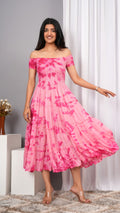 Iqraar Women Tie and Dye Dyed Smocked Off-Shoulder Fit and Flare Midi Baby pink Dress