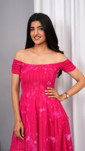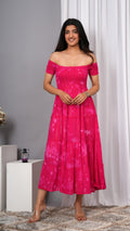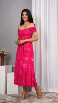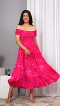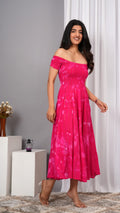 Iqraar Women Tie and Dye Dyed Smocked Off-Shoulder Fit and Flare Midi Pink Dress