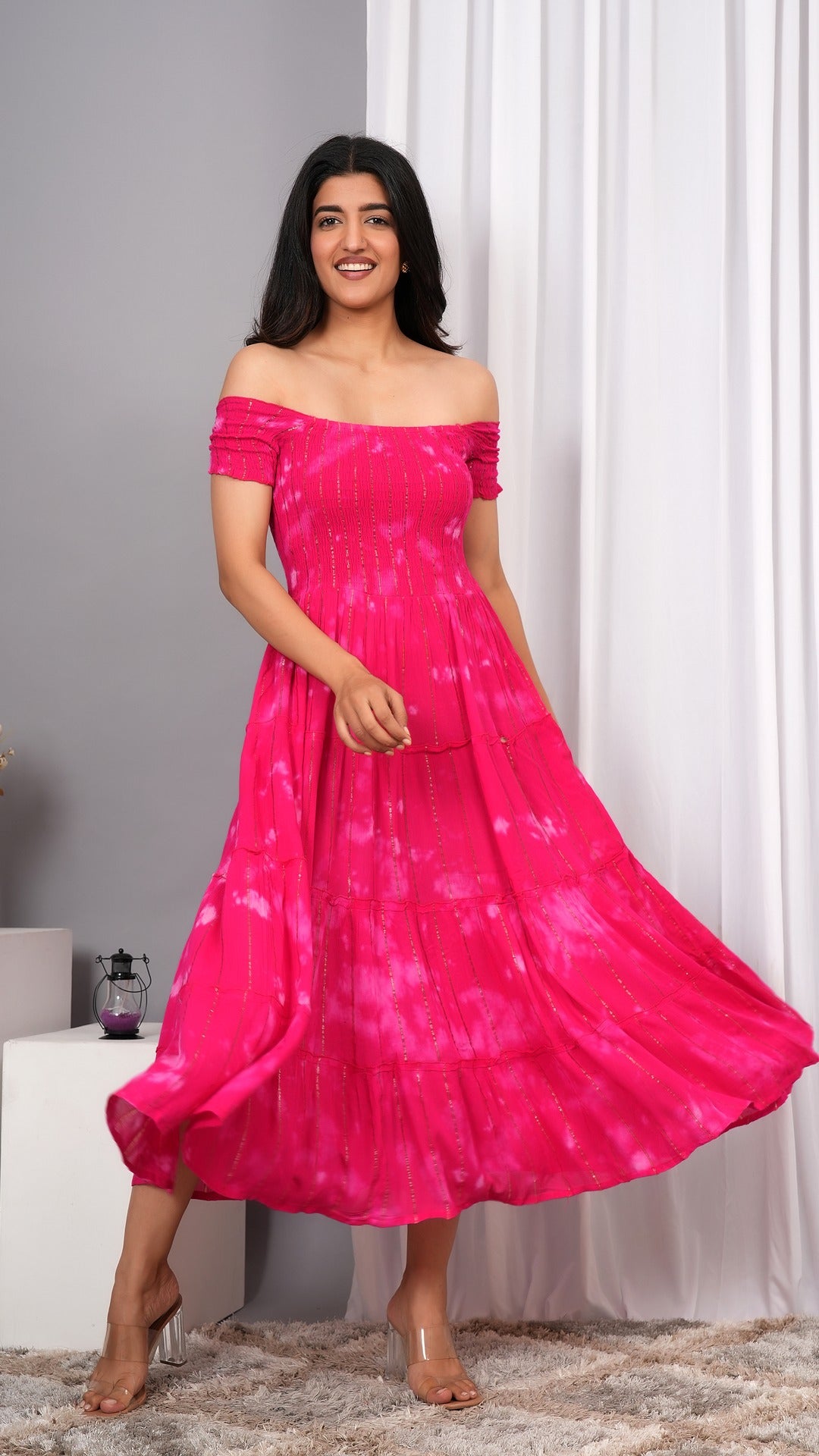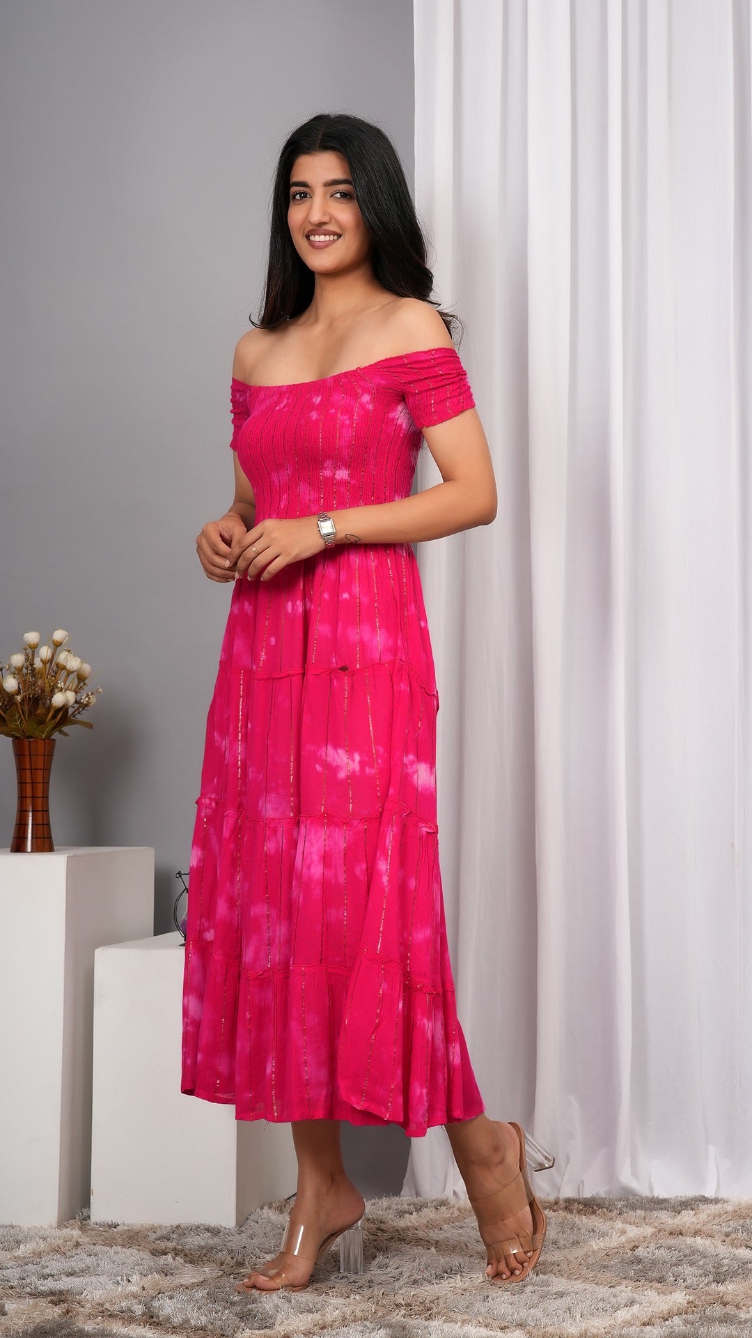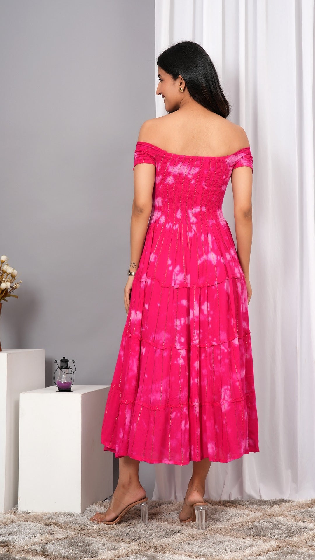 Elevate your wardrobe with the Iqraar Women Tie and Dye Dyed Smocked Off-Shoulder Fit and Flare Midi Pink Dress. Featuring a delicate off-shoulder neckline and a smocked bodice, this dress offers both comfort and style. The tie-and-dye pattern creates a unique, vibrant look, while the fit and flare silhouette flatters your figure effortlessly. Ideal for casual outings or special occasions, this midi dress blends contemporary design with timeless charm.