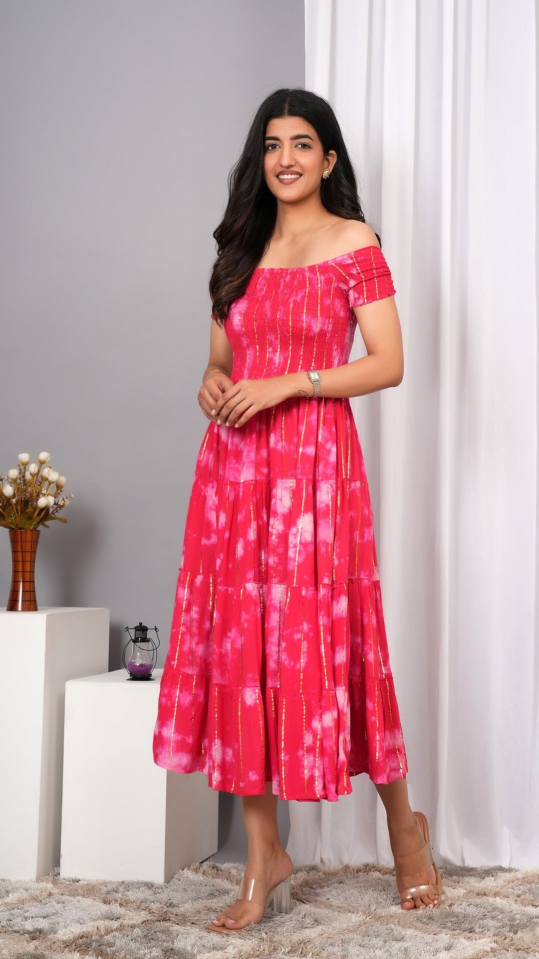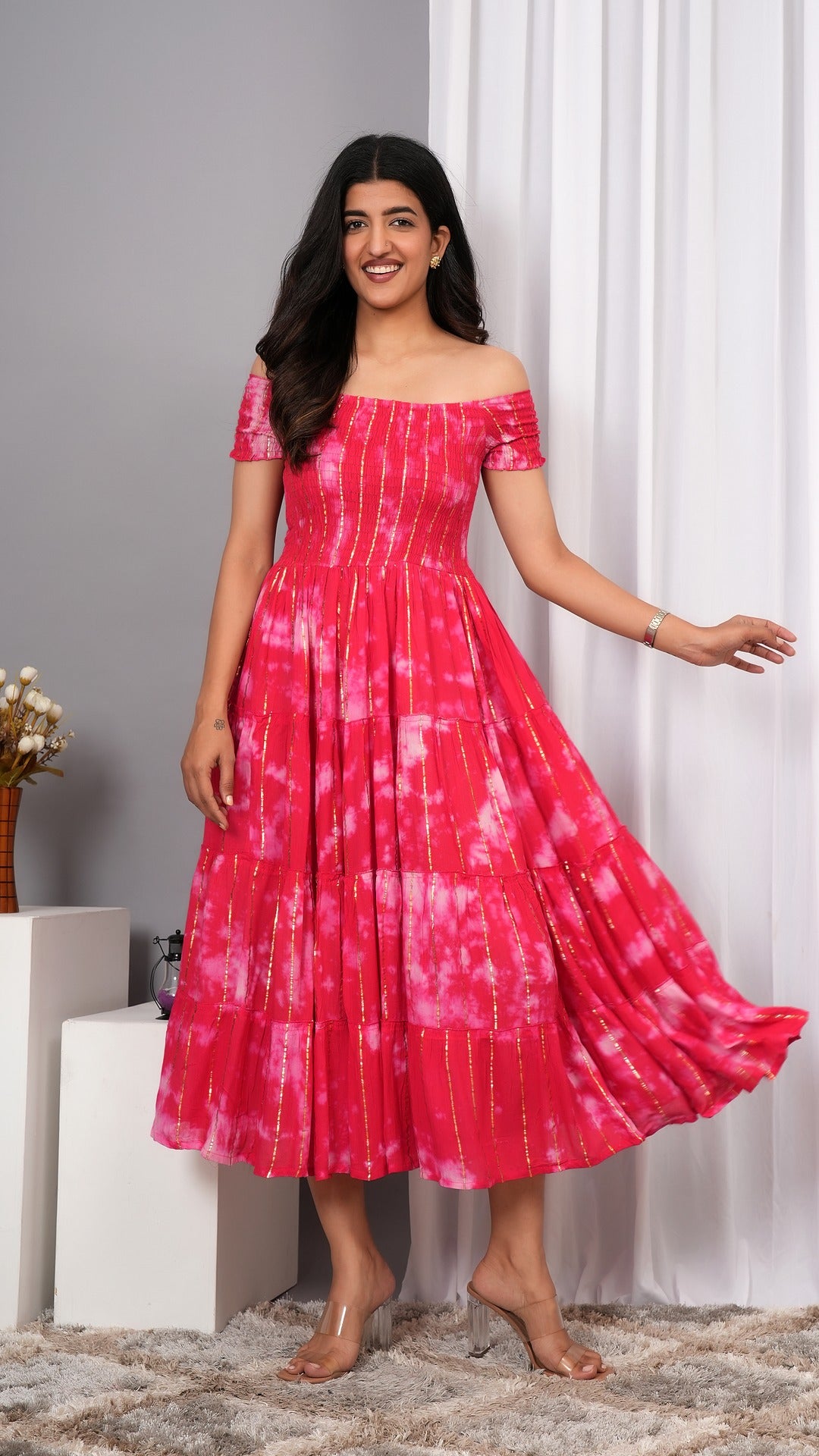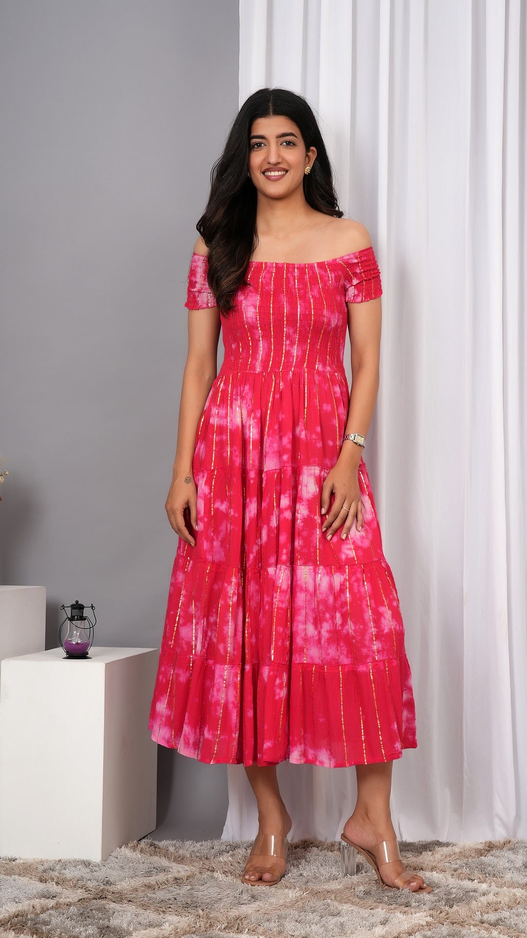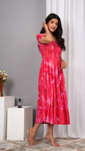 Elevate your wardrobe with the Iqraar Women Tie and Dye Dyed Smocked Off-Shoulder Fit and Flare Midi Red Dress. Featuring a delicate off-shoulder neckline and a smocked bodice, this dress offers both comfort and style. The tie-and-dye pattern creates a unique, vibrant look, while the fit and flare silhouette flatters your figure effortlessly. Ideal for casual outings or special occasions, this midi dress blends contemporary design with timeless charm.