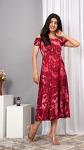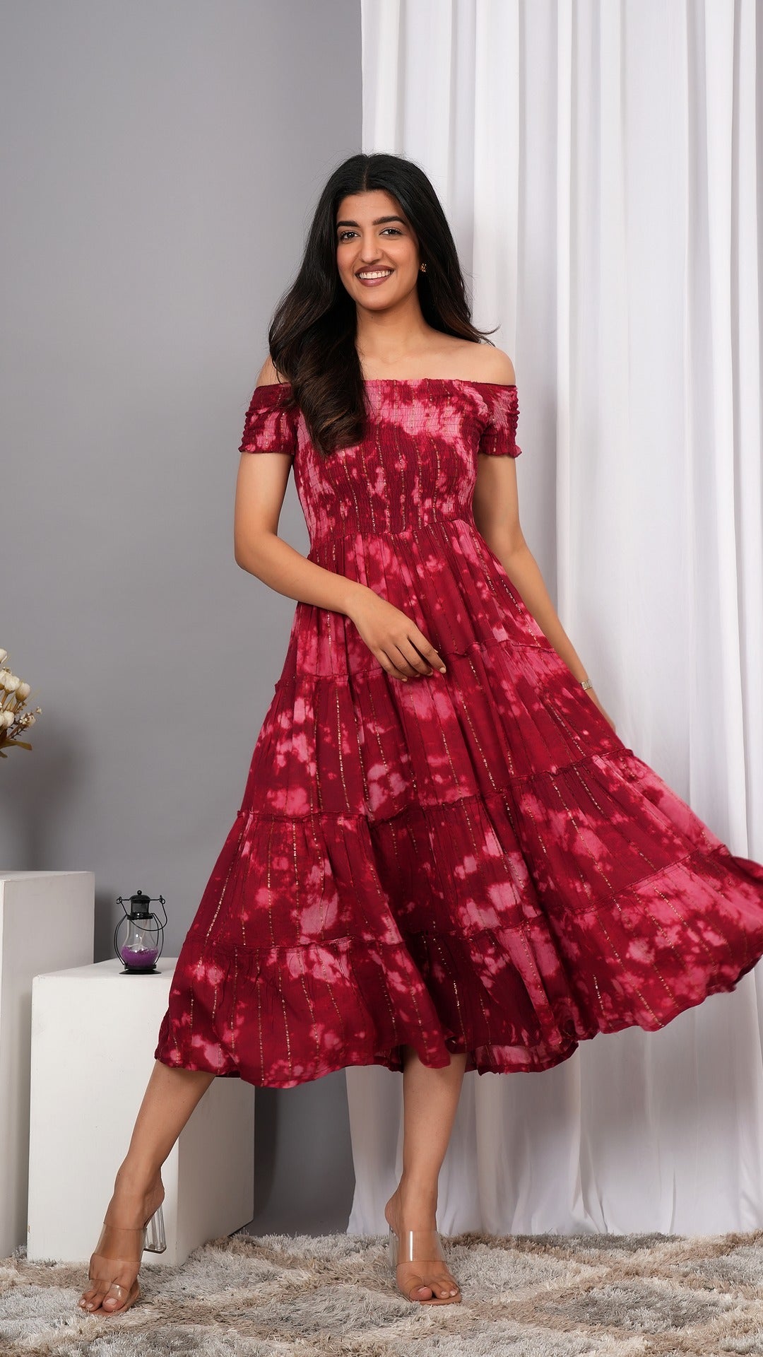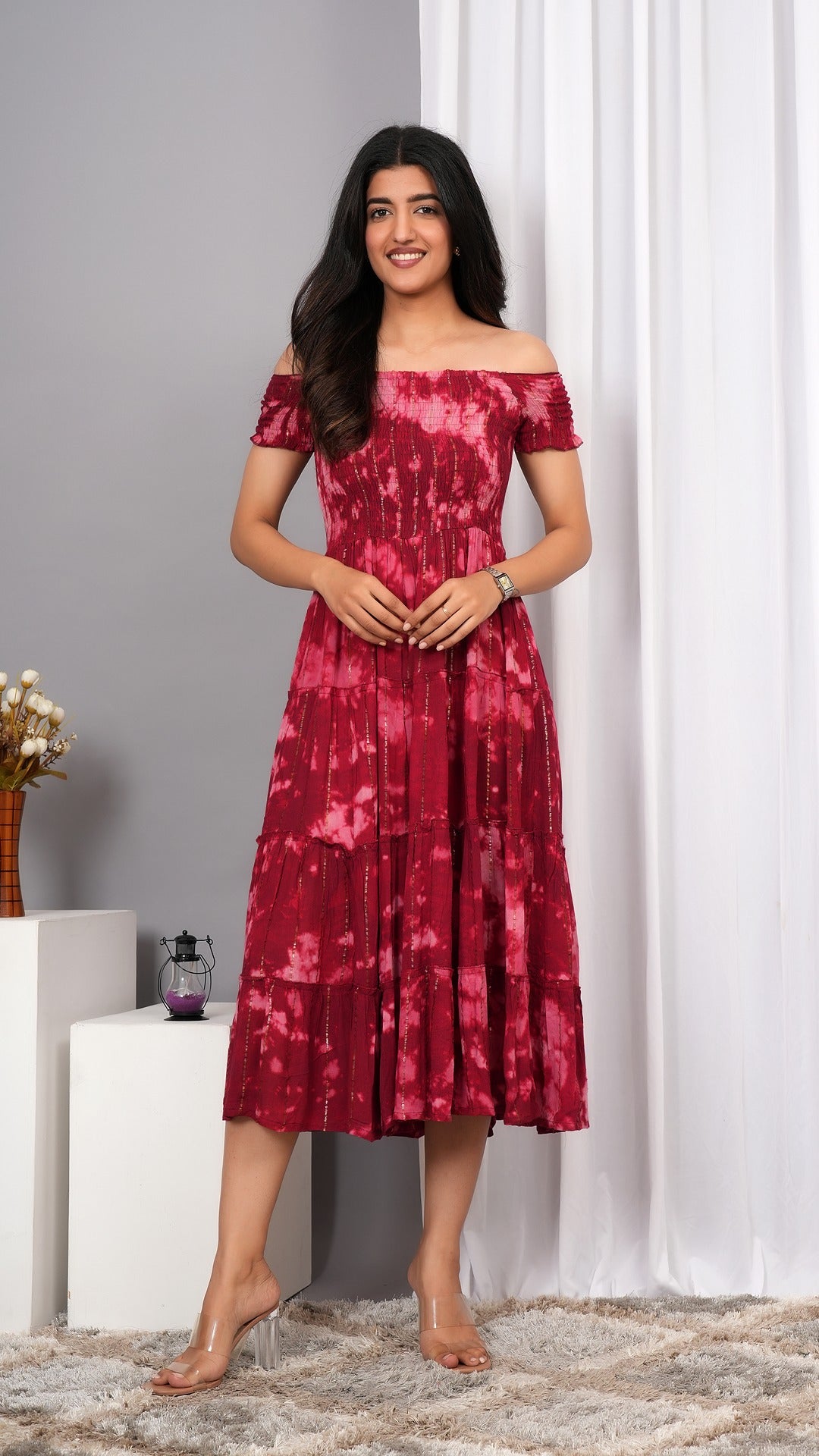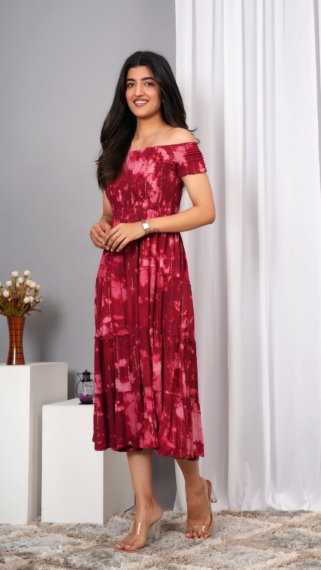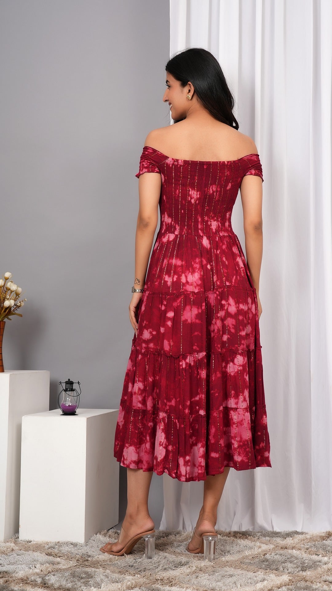 Iqraar Women Tie and Dye Dyed Smocked Off-Shoulder Fit and Flare Midi Wine Dress