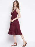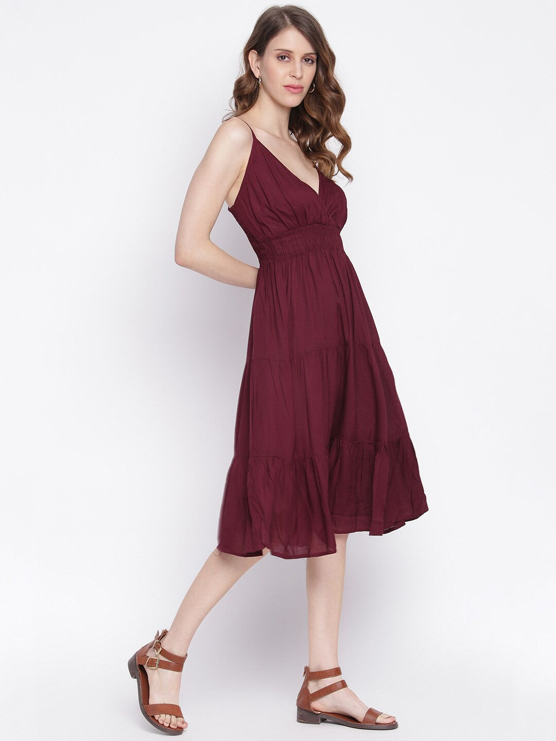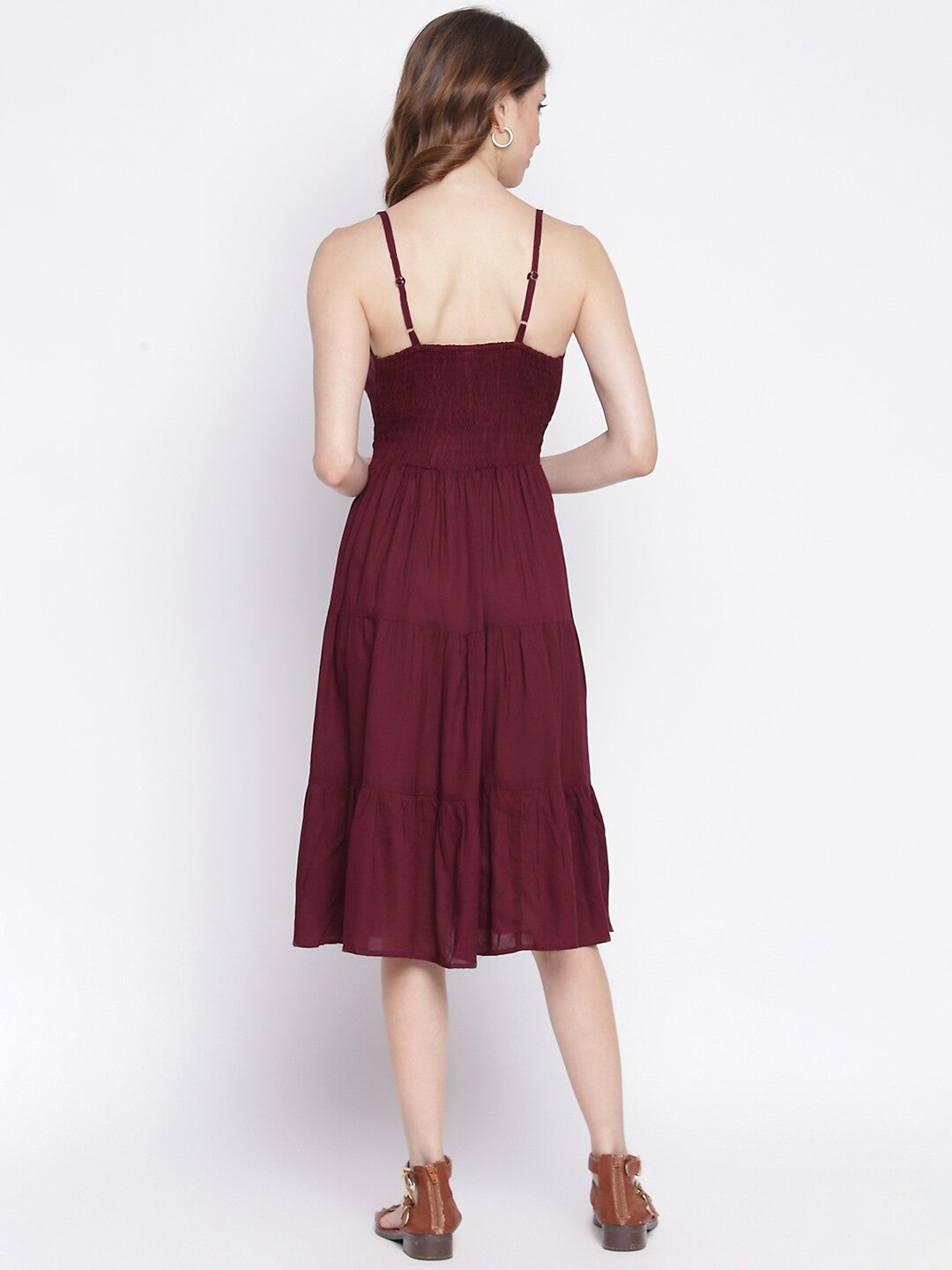Expertly crafted with a layered detail and a flared hem, this purple midi dress is a statement piece for any occasion. Made from soft viscose rayon, it features shoulder straps and a sleeveless design for a comfortable fit. Machine washable for easy care. Model is 5'8 and wearing size S.