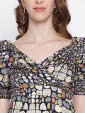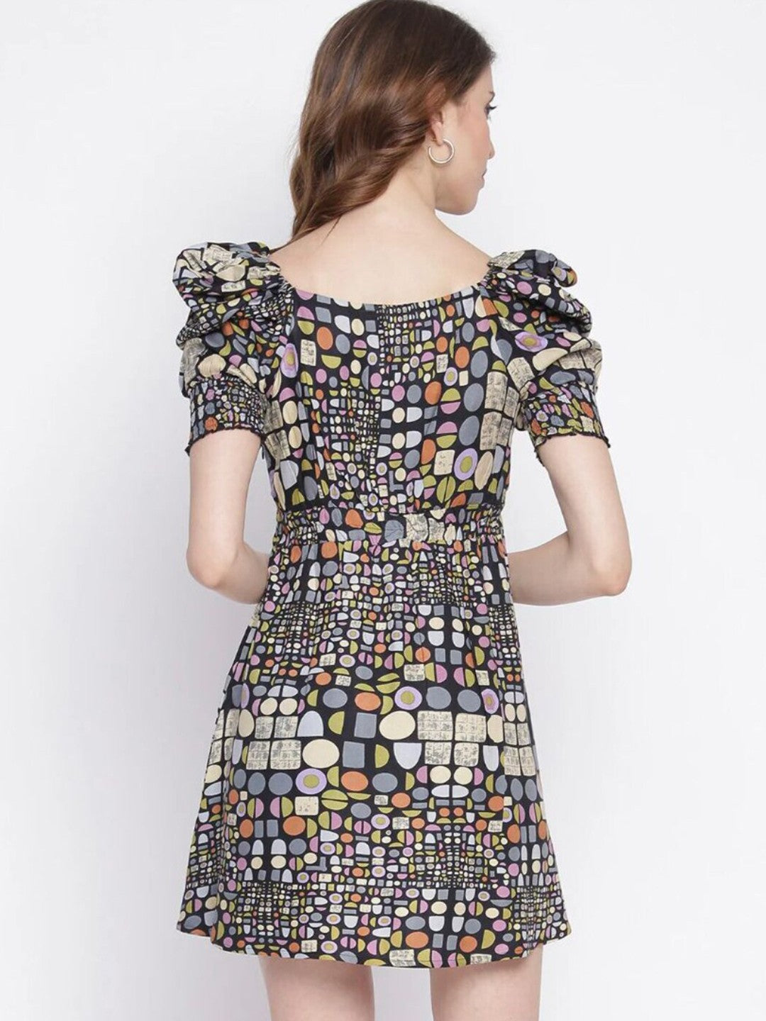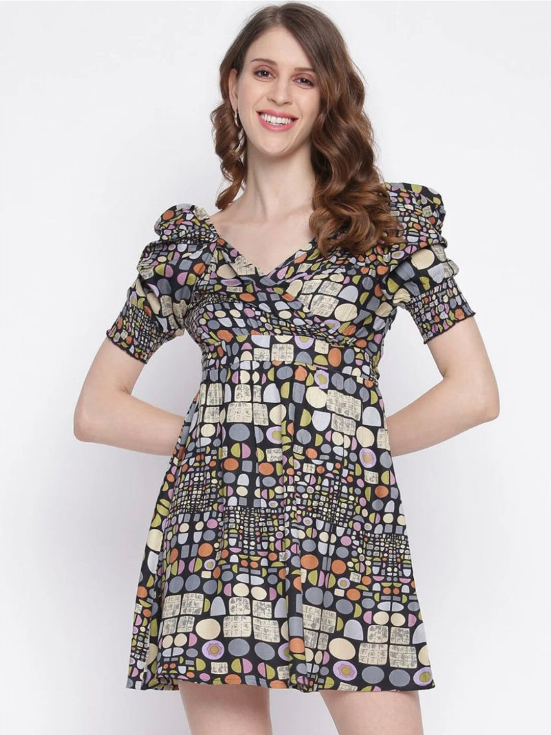 This Women Black Geometric Printed Wrap Dress features a striking black geometric print that is both trendy and versatile. The V-neck and short, regular sleeves provide a flattering fit, while the mini length and flared hem add a touch of fun and style. Made with durable and easy-to-care-for polyester, this dress is perfect for any occasion.