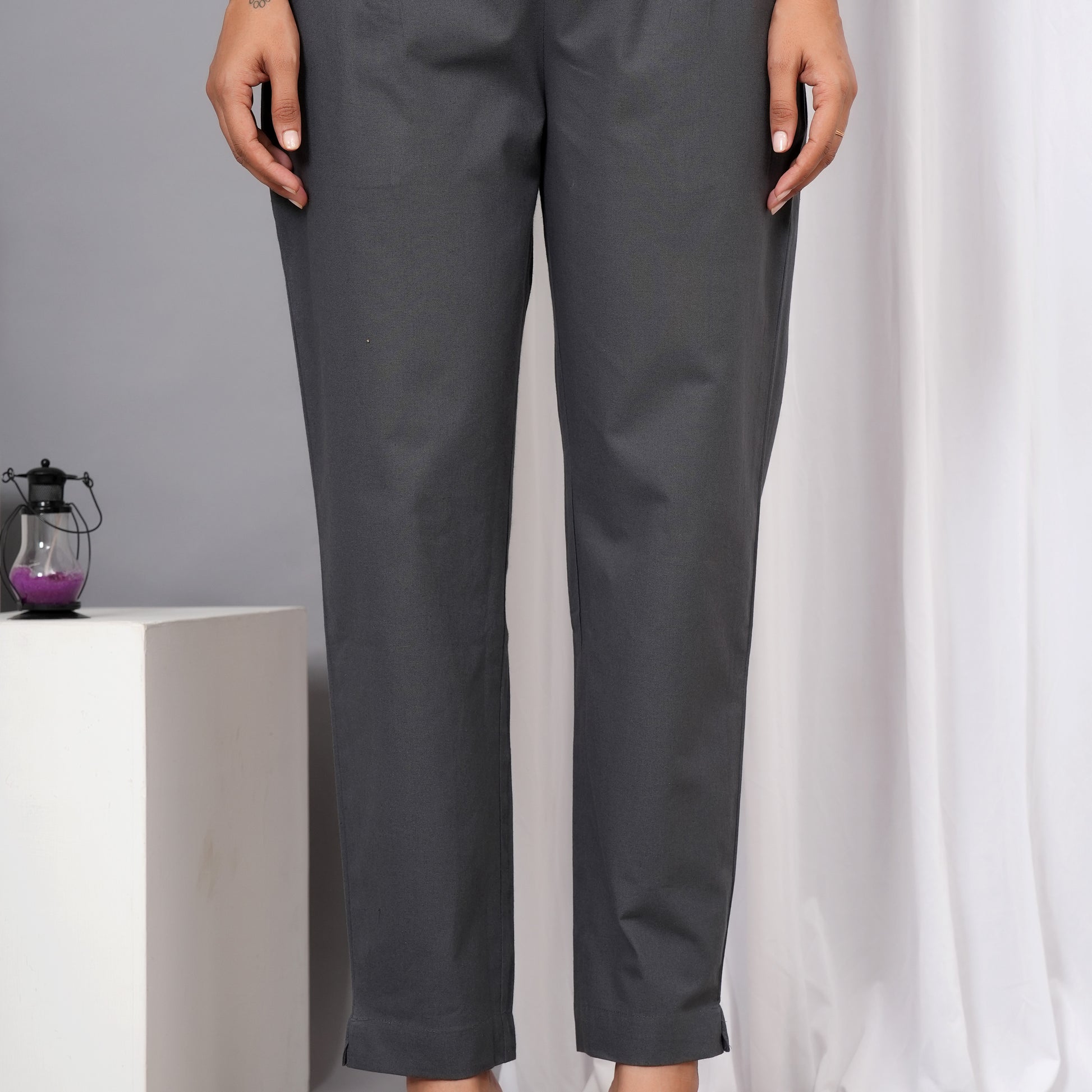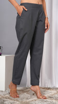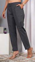 These women’s regular fit trousers from Iqraar are crafted from 100% pure cotton, offering breathability and comfort for daily wear. Their tailored regular fit ensures ease of movement while maintaining a sleek silhouette. Ideal for casual or semi-formal settings, these gray trousers combine durability with a refined look suitable for versatile styling.